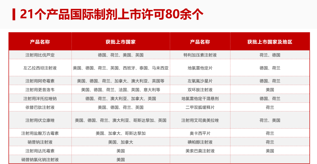 依托高标准质量管理以及高品质生产线,普利制药已有16个针剂和5个口服共计21个产品先后获得多个国家和地区的上市许可80余个,其中13款产品还实现了在国外获批上市的同时,在国内通过或者视同通过仿制药一致性评价。