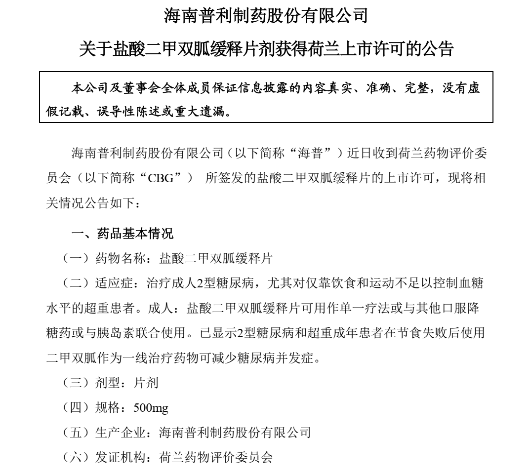海南普利制药股份有限公司近日收到荷兰药物评价委员会(CBG)所签发的盐酸二甲双胍缓释片的上市许可,标志着普利制药具备了出口并在荷兰销售盐酸二甲双胍缓释片的资格,也标志着唐必呋不止是普通的二甲双胍,而是具有出口品质的二甲双胍,其质量、疗效、安全性获得国内外广泛认可。