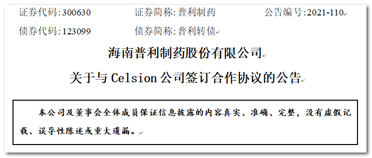海南普利制药股份有限公司(以下简称“公司”或“普利制药”)于近日与美国生物制药Celsion Corporation(以下简称“Celsion 公司”)签署了关于DNA疫苗的相关合作协议,双方本着“平等自愿、资源共享、优势互补、协同发展”的原则开展合作,普利制药将为Celsion 公司生产DNA疫苗的临床批样品以及在该产品获得批准使用的商业批供货。
